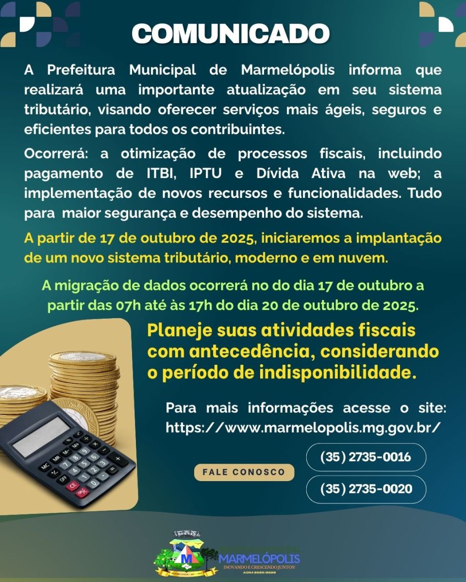 A Prefeitura Municipal de Marmelópolis informa que realizará uma importante atualização em seu sistema tributário, visando oferecer serviços mais ágeis, seguros e eficientes para todos os contribuintes.