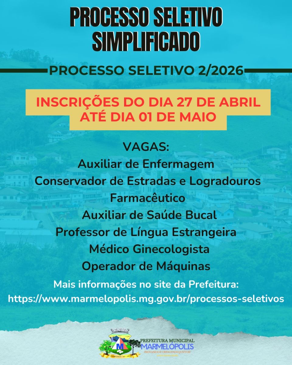 O presente formulário, publicado pela Prefeitura Municipal de Marmelópolis/MG, será para o recebimento de inscrições dos(as) candidatos(as) para o Processo Seletivo 2/2026 para os seguintes cargos, Auxiliar de Enfermagem, Conservador de Estradas e Logradouros, Farmacêutico, Auxiliar de Saúde Bucal, Professor de Língua Estrangeira , Médico Ginecologista e Operador de Máquinas.